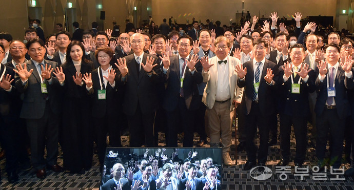 26일 오전 서울시 용산구 서울드래곤시티에서 개최된 ‘리월드포럼(ReWorldForum)’에서 최윤정 중부일보 사장, 윤종수 리월드포럼 공동대표, 전하진 SDX재단 이사, 김상협 2050 탄소중립녹색성장위원회 위원장, 최정규 리월드포럼 상임대표 등 내빈들이 기념사진을 찍고 있다. 김경민 기자